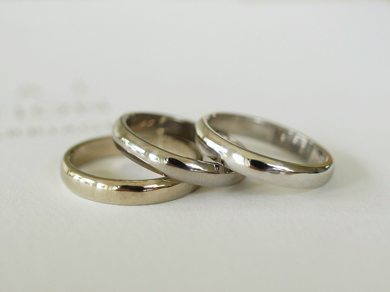右から、プラチナ(Pt900)、ホワイトゴールド(K18WG)、シャンパンゴールド(K18WG)です。