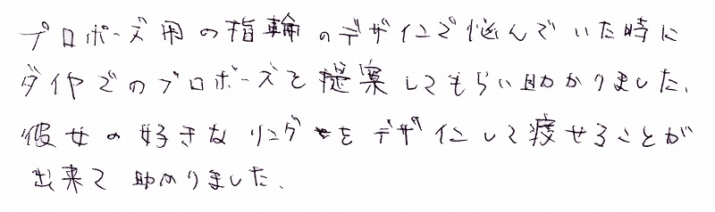 K様、この度はありがとうございました、ご婚約誠におめでとうございます。