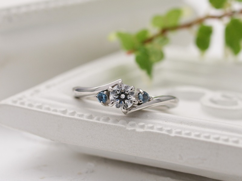 ダイヤの両サイドは爽やかなブルーが映えるアクアマリン。