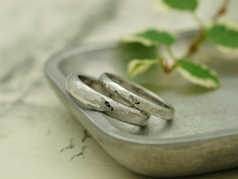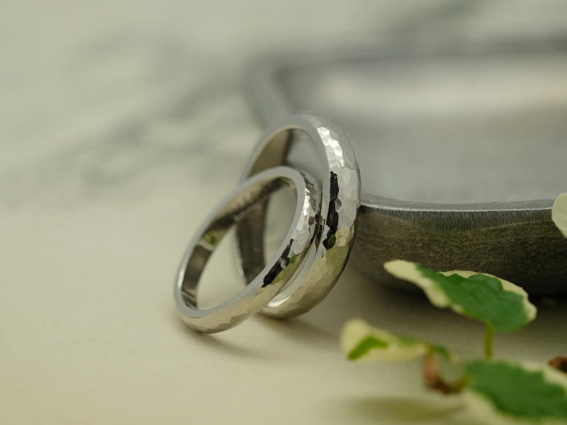 プラチナを贅沢に使い、仕上げの段階で職人が手打ちで1本ずつ丁寧に鎚目加工を施しました。