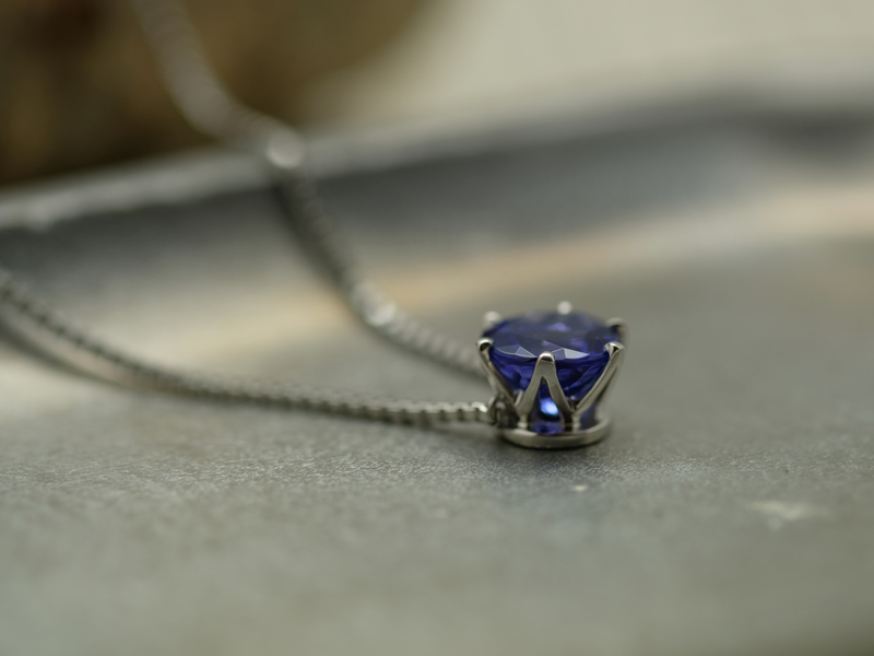 結納返しの記念品として、誕生石のタンザナイトをメインにしたプラチナネックレスを作らせていただきました。