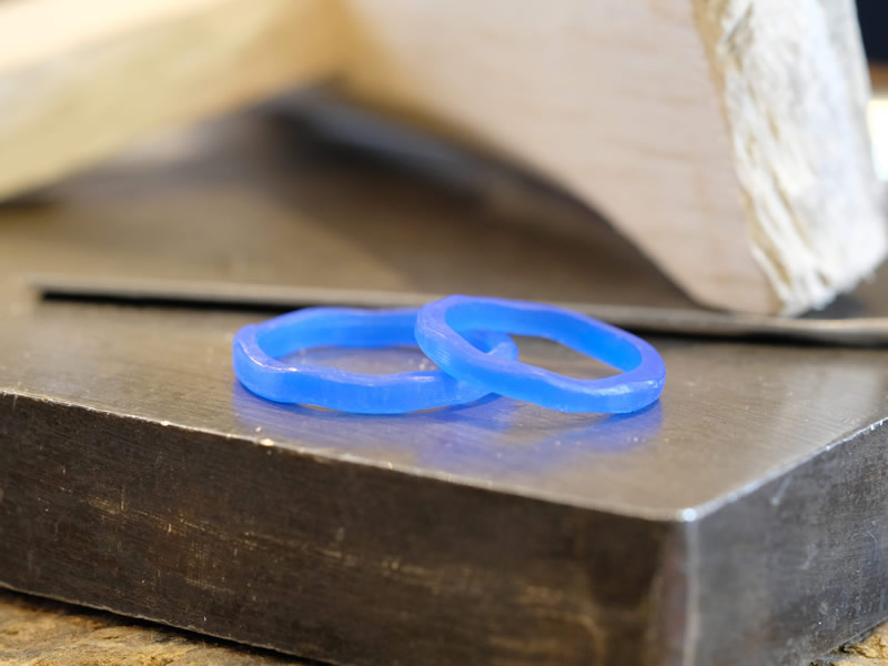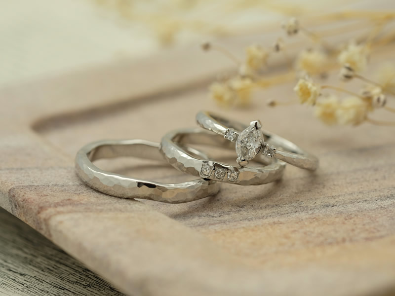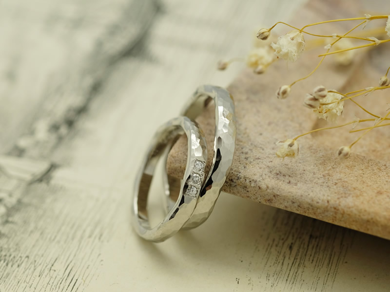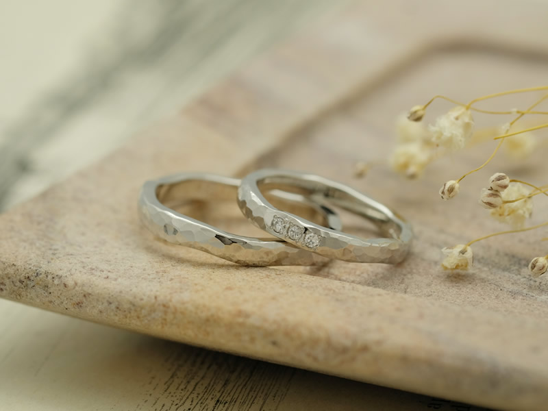 セットでご依頼いただいたご婚約指輪と合わせて、鎚目を入れた手作り結婚指輪です。