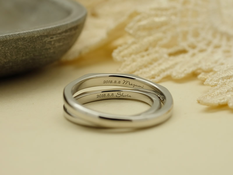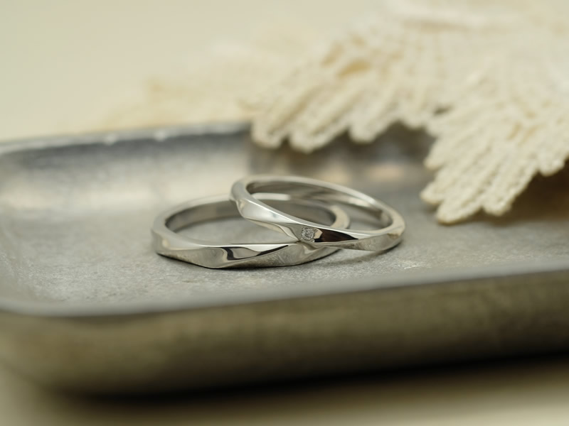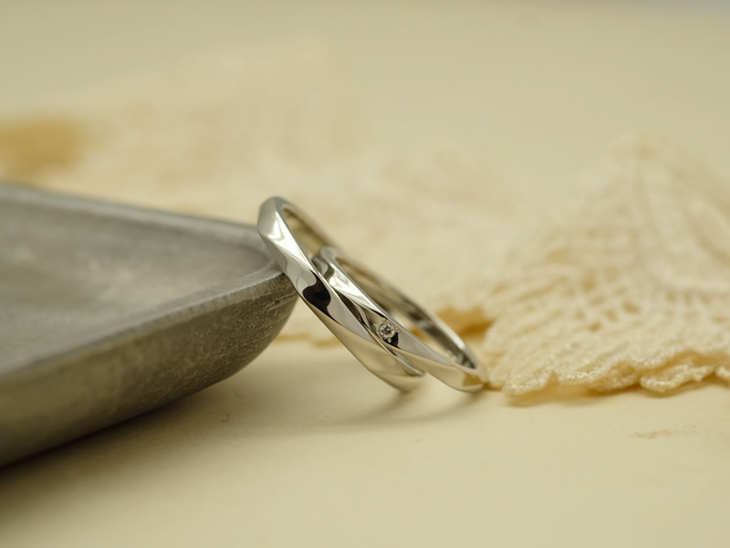 リングの半分を、ねじったような立体感をつけることで陰影で繊細でエレガントな雰囲気のある結婚指輪が完成いたしました。