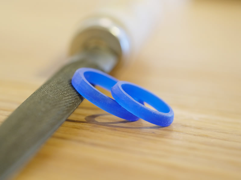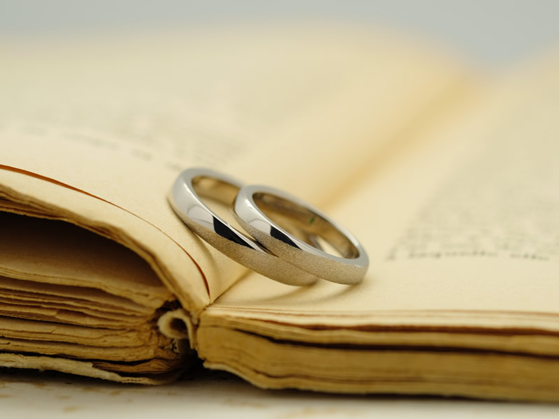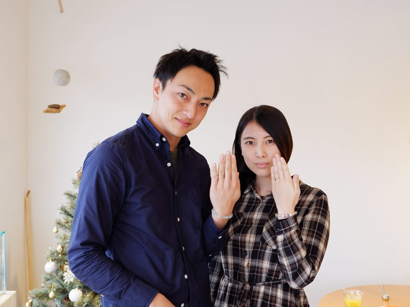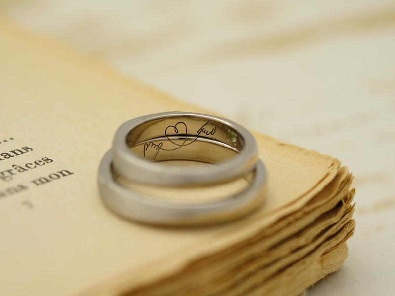 鏡面仕上げとマット仕上げの切り替えが入ったシンプルなデザインですが、リングを2本重ねたときに内側にあらわれる仕掛けがお二人のこだわりポイントです。