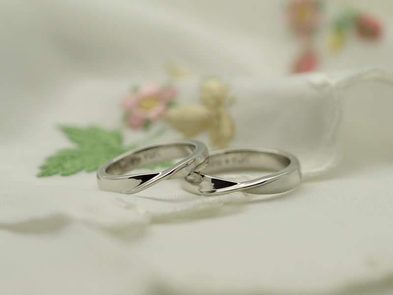 ストレートのラインは、婚約指輪との重ね付けも出来るデザインで正面のねじりがシンプルながらも存在感があります。