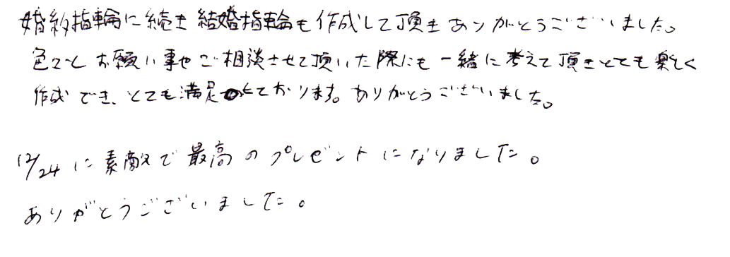 婚約指輪に続き結婚指輪も作成して頂きありがとうございました。