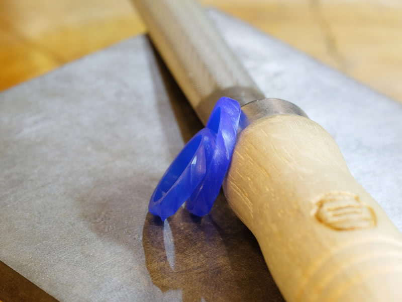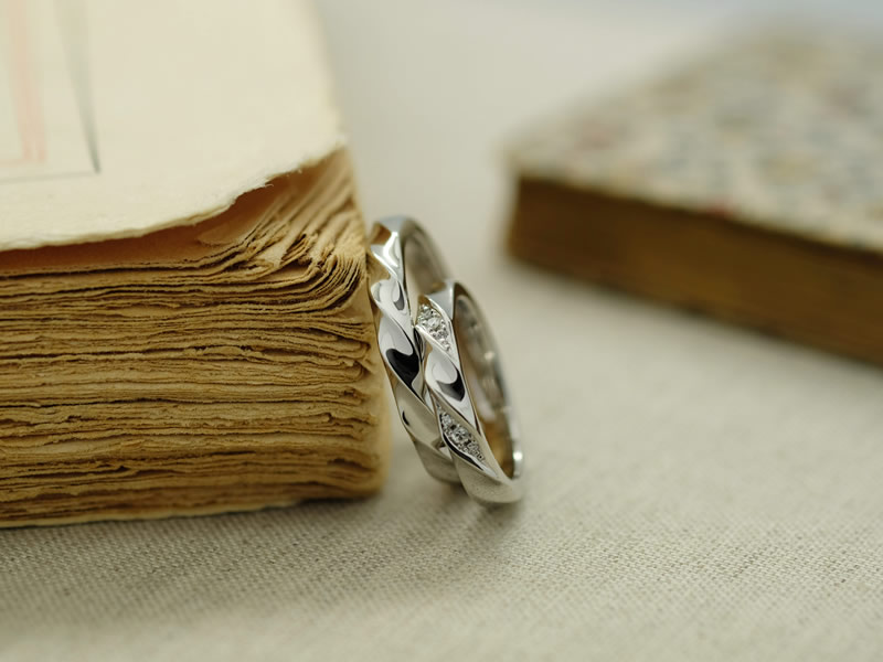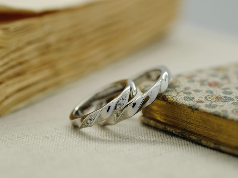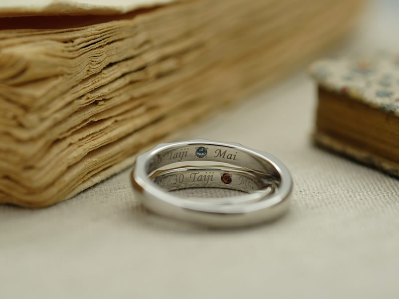 お二人のお好みでねじり部分を削っていただいた上で、職人の手で外側と内側にそれぞれダイヤモンドと誕生石を入れることにより、お二人らしい個性のあるリングとなりました。