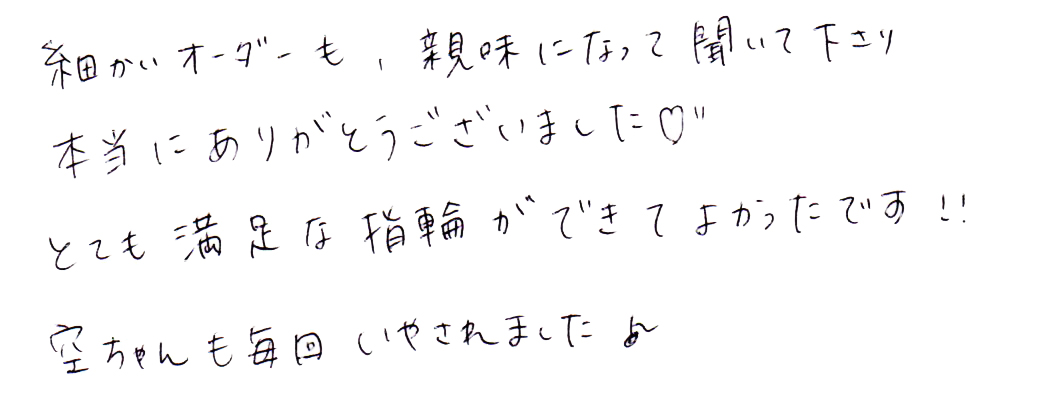 細かいオーダーも、親身になって聞いてくださり、本当にありがとうございました。