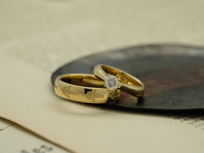 指輪を重ねたときに、太陽のマークが現れるように彫り加工をし