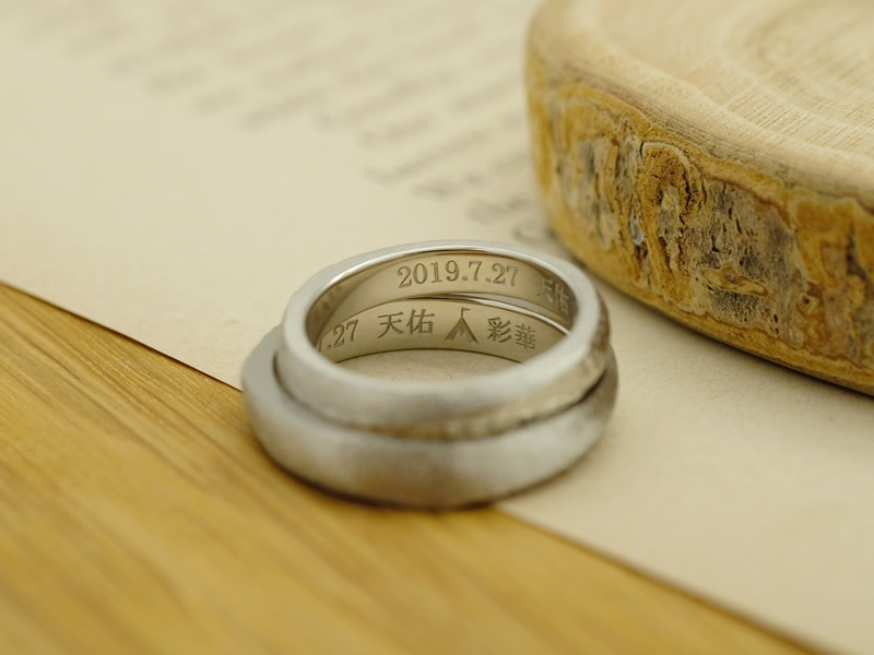 キャンプが大好きというアウトドアなお二人らしく、内側にはお名前の間にテントのシルエットを彫り、オリジナリティのある結婚指輪が完成いたしました。
