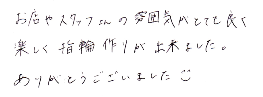 お店やスタッフさんの雰囲気がとても良く、楽しく指輪作りが出来ました。
