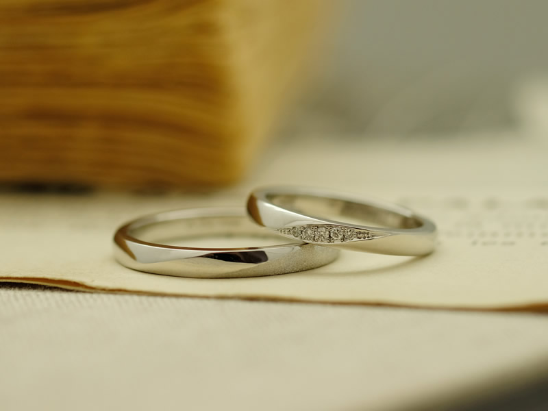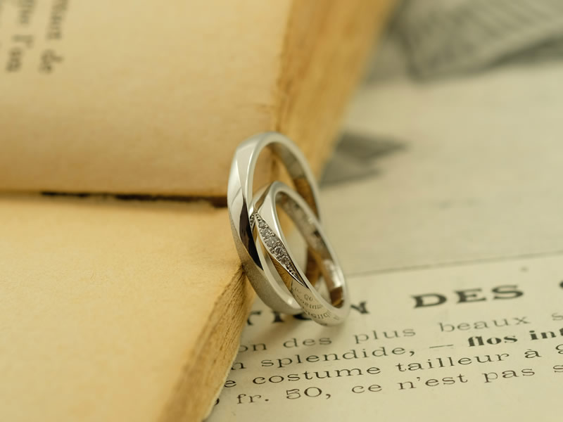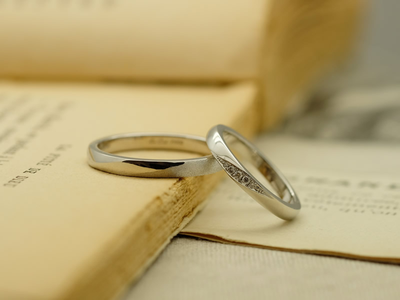 最初にご来店いただいた際に過去制作のアルバムやたくさんのサンプルリングをご覧になって、ピンときたデザインをベースに、お二人らしいアレンジを加えていきました。