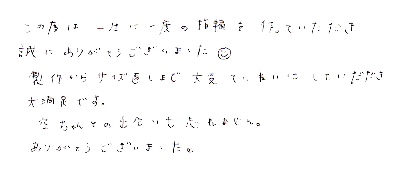この度は一生に一度の指輪を作っていただき誠にありがとうございました。
