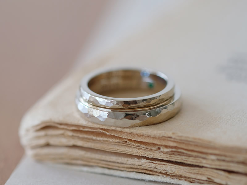 シャンパンゴールドの鎚目加工は、ご婚約指輪と同じ素材・仕上げとなっております。