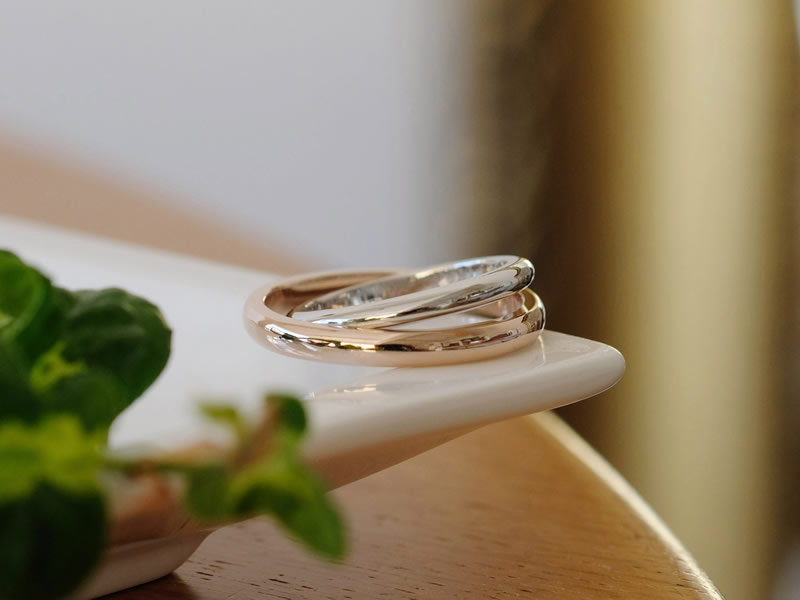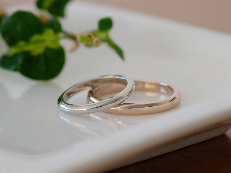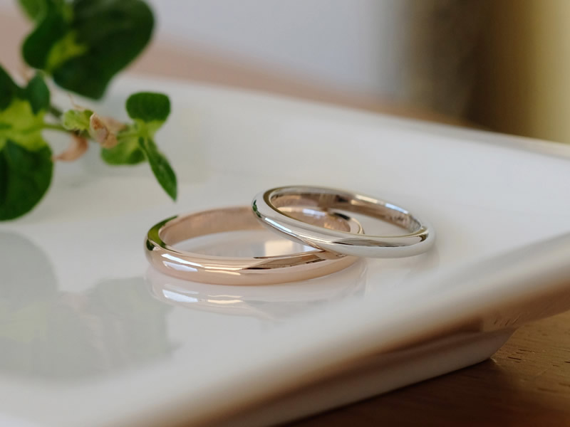 ご結婚指輪はシンプルなものをご希望でしたので、それぞれ指に着けたときの雰囲気やバランスでお好きな形を選んでいきました。