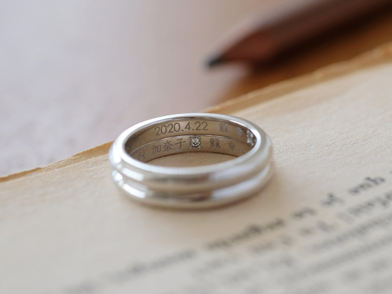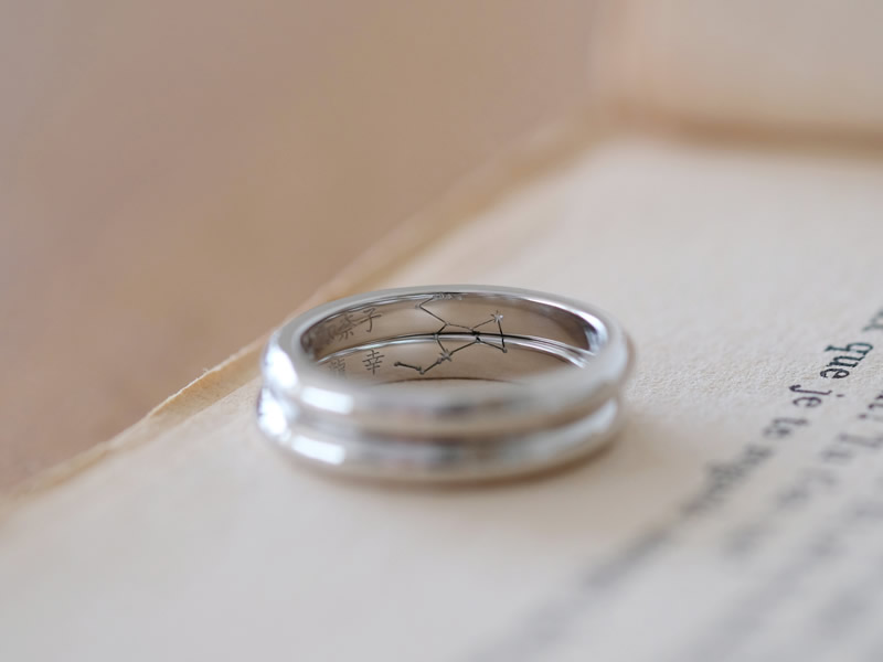 シンプルなプラチナのマリッジリングの内側には、お二人の思い出の「オリオン座」を重ねて繋がるように彫りました。
