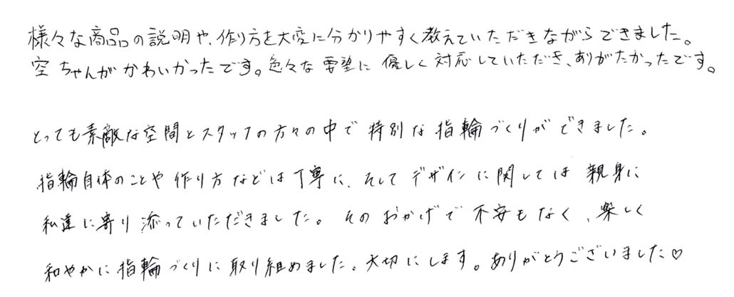 そのおかげで不安もなく、楽しく和やかに指輪づくりに取り組めました。大切にします。