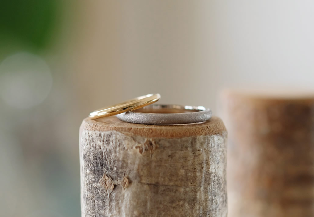 男性用はツヤを抑えた落ち着いた雰囲気のシンプルなデザインで、それぞれ普段の日常での使いやすさを大切に指輪作りを進められました。