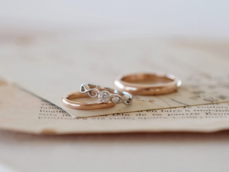 セットでご依頼いただいたオーダーメイドの婚約指輪との相性も良く、重ね付けすることでより可愛らしさが出ます。