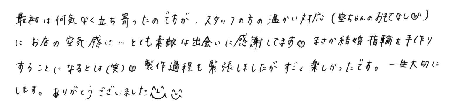 まさか結婚指輪を手作りすることになるとは(笑)製作過程も緊張しましたがすごく楽しかったです。