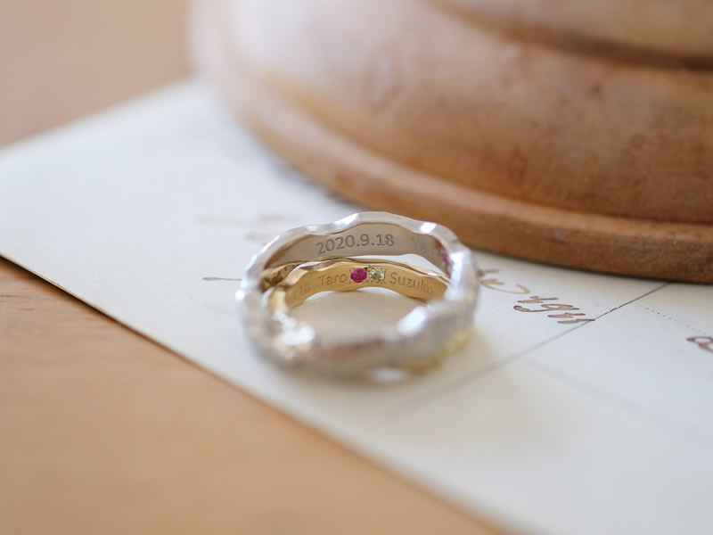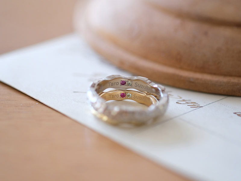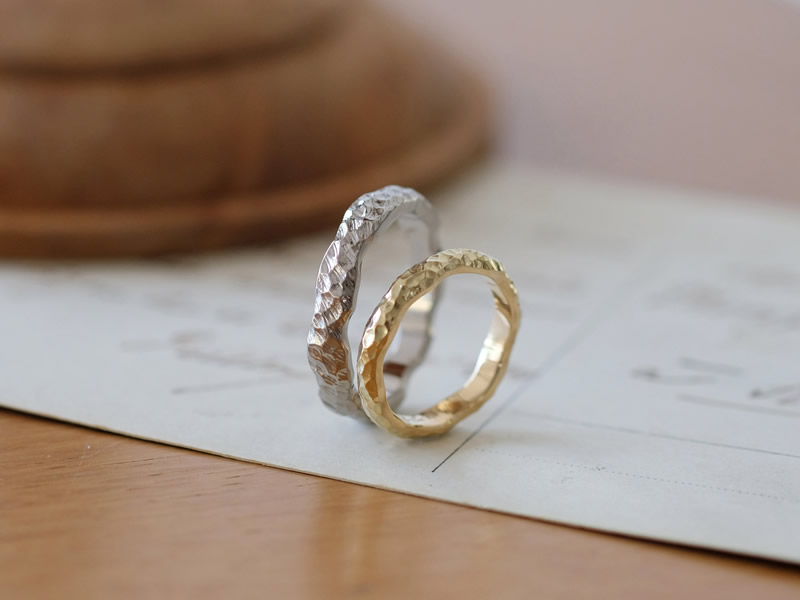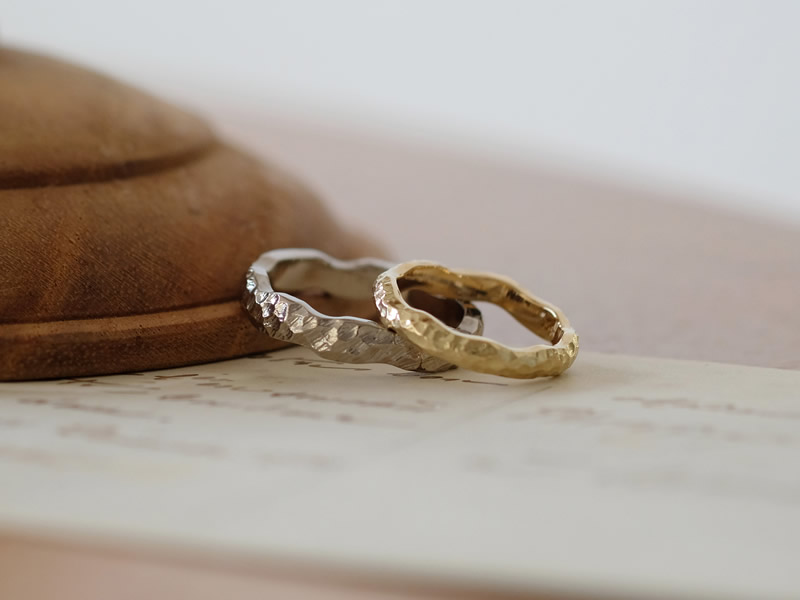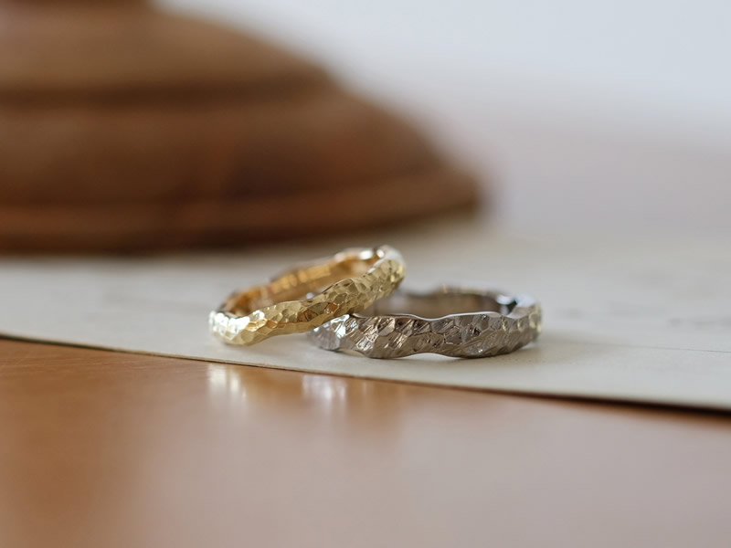 ご自身で入れた凸凹やランダムカットは唯一のものとなり、この世に一つしかない手作り結婚指輪です。