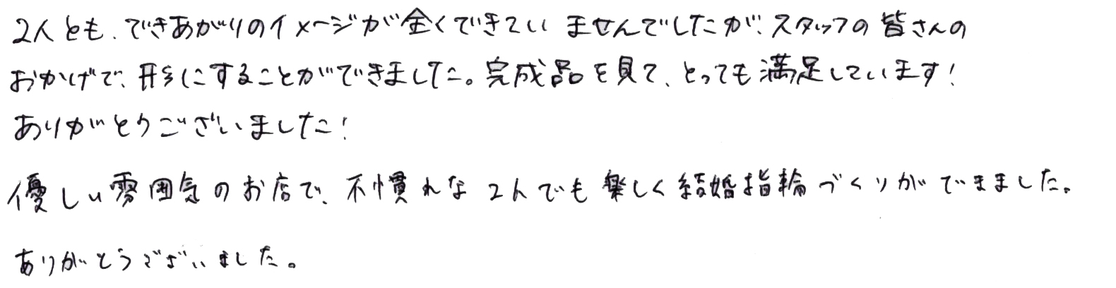 優しい雰囲気のお店で、不慣れな2人でも楽しく結婚指輪づくりができました。ありがとうございました。