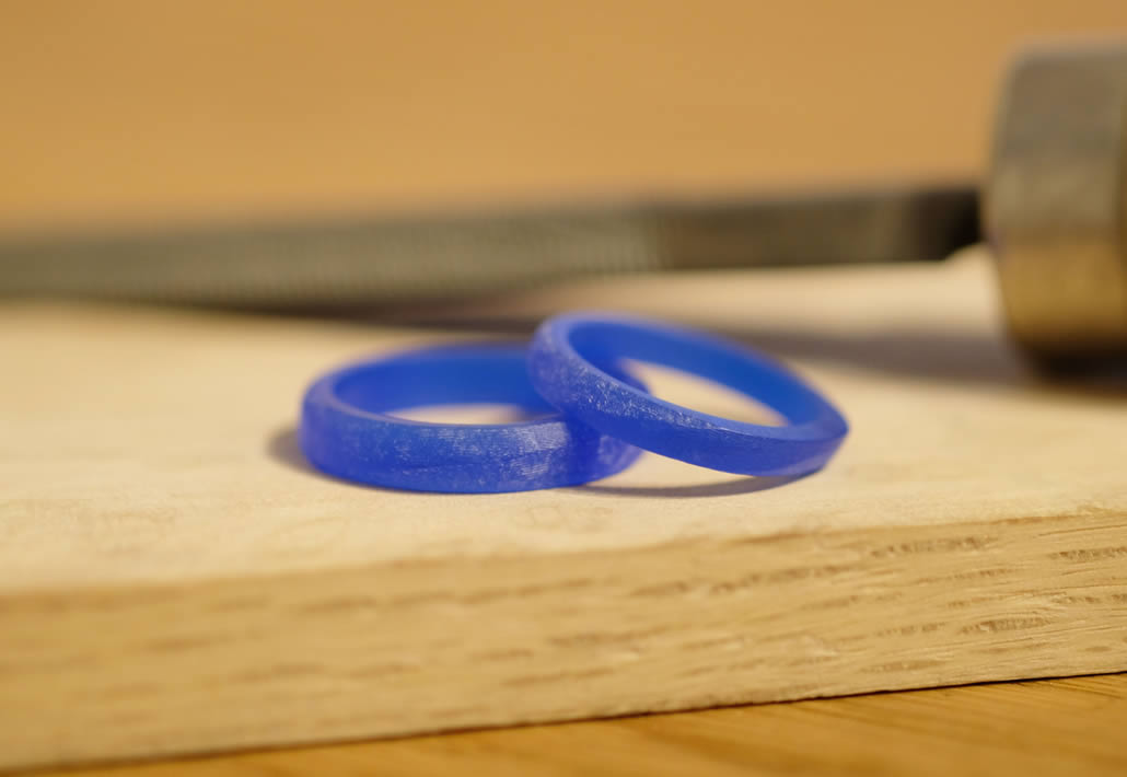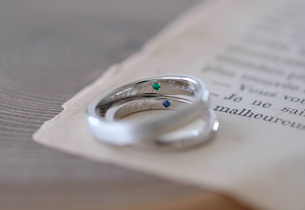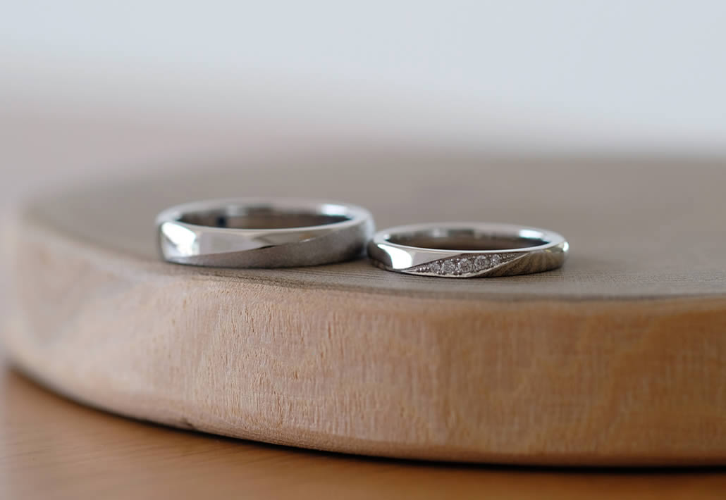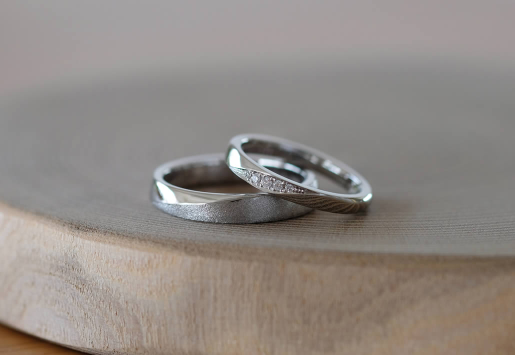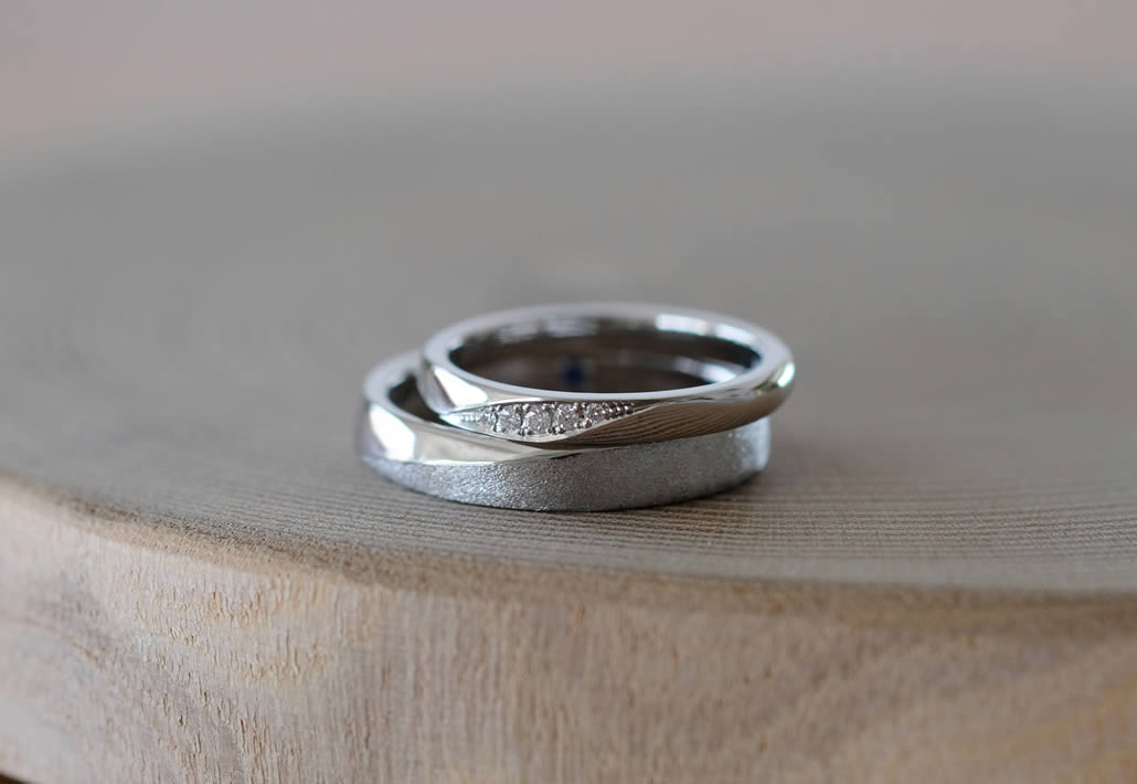 店頭のサンプルを参考に女性は中心にダイヤモンドを彫留しきらびやかに、男性は仕上がりを鏡面とマットにすることで、指輪の表情を楽しめる手作り結婚指輪となりました。