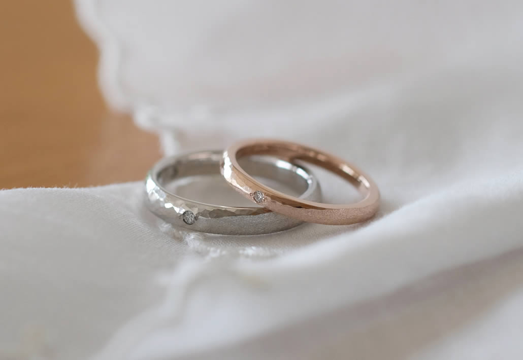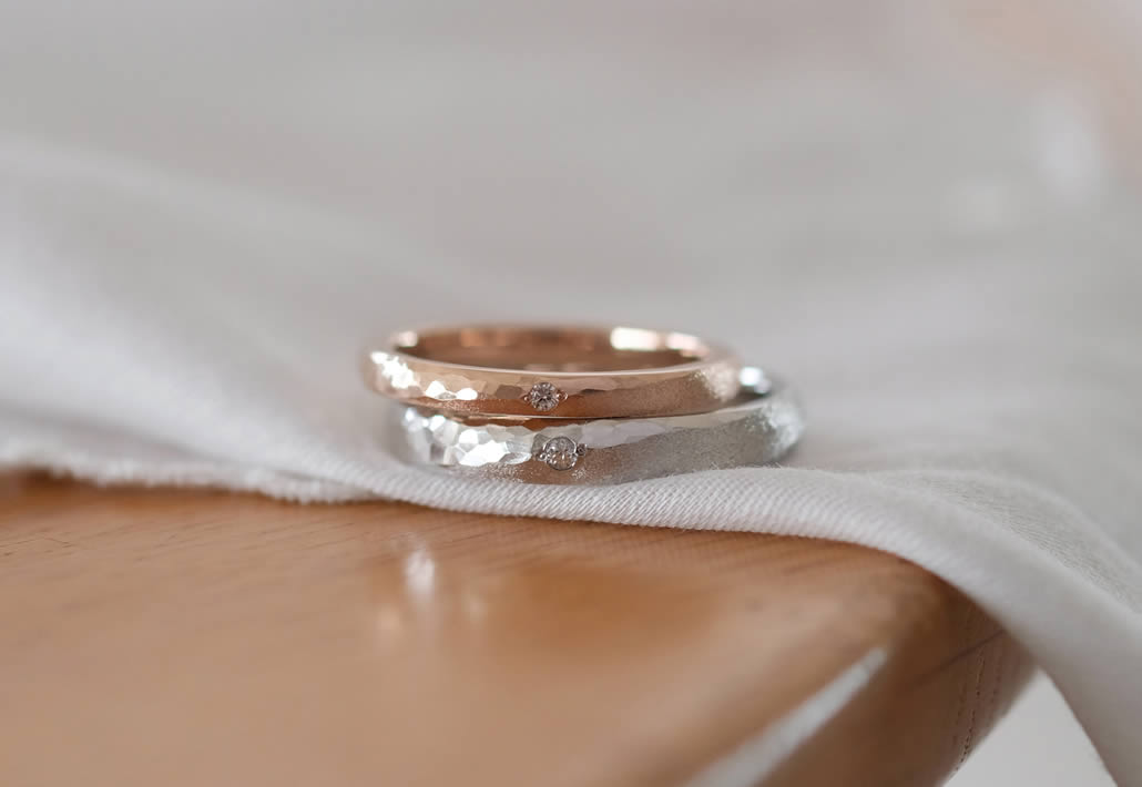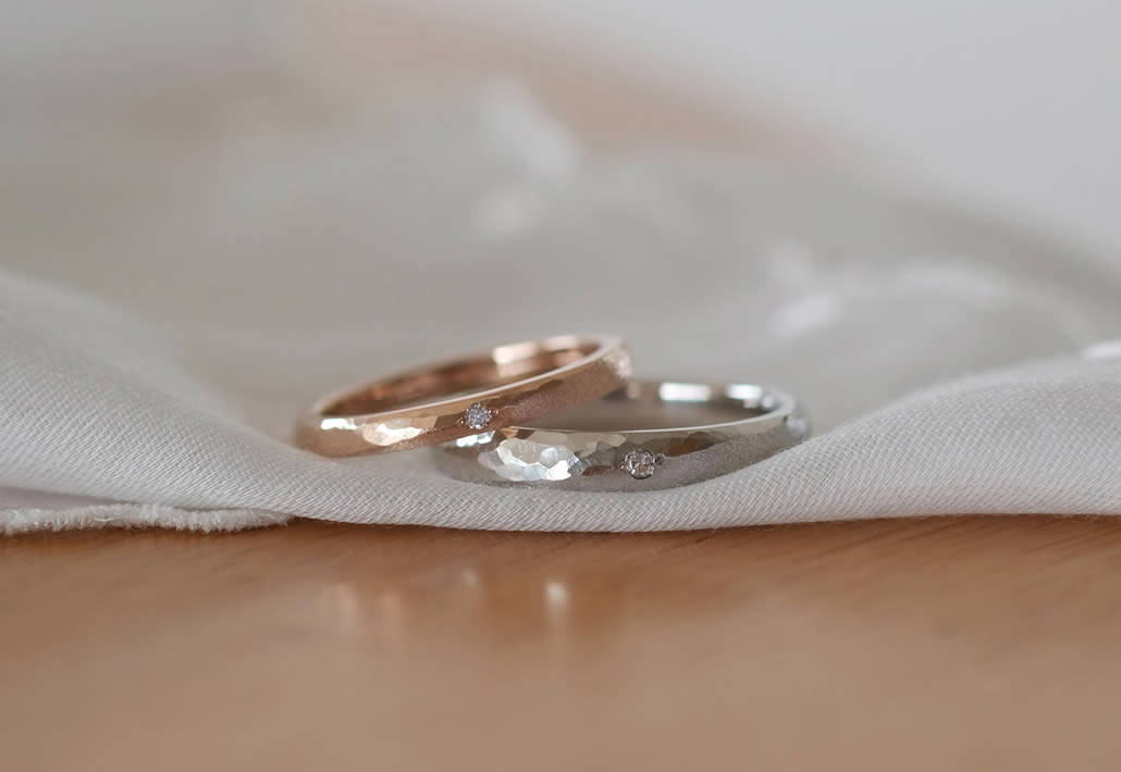 鎚目とマットのコンビネーション仕上げが味わい深い質感を感じる結婚指輪です。