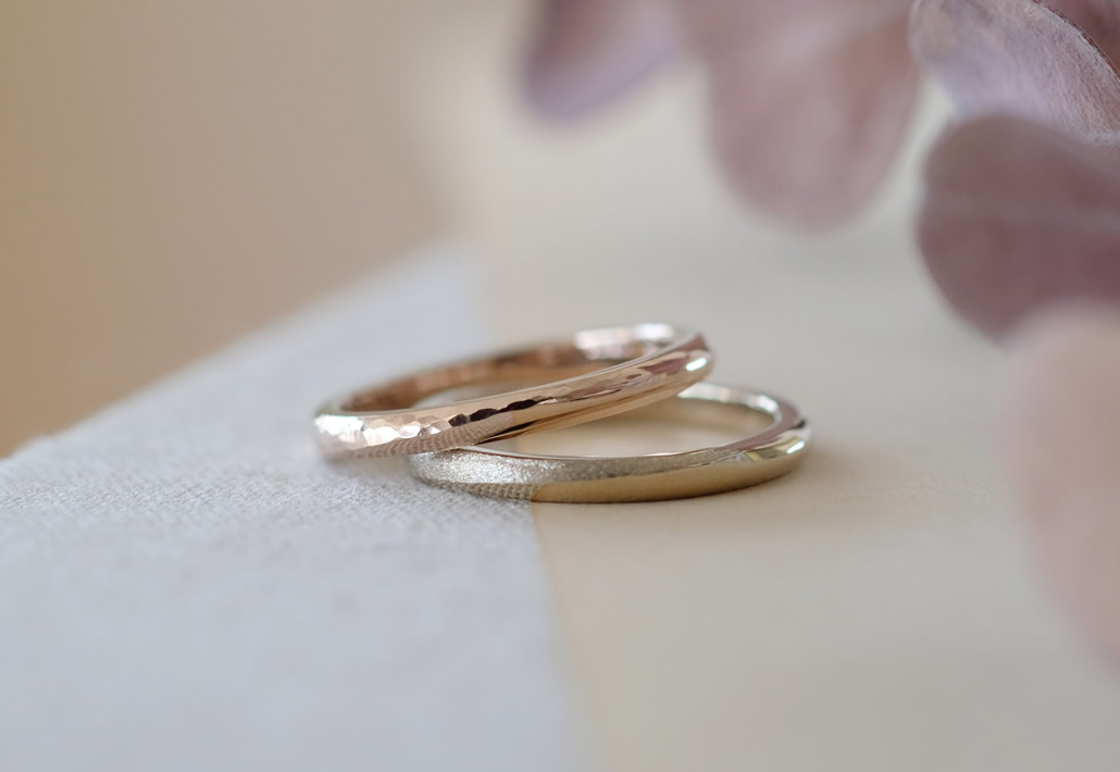 好みが似ていたお二人は指輪の幅はお揃いにし、仕上げと素材はお二人が気に入ったものを取り入れております。