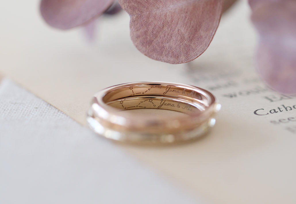 リング内側には、女性が手書きされた【ふたご座】を彫刻させていただきました。