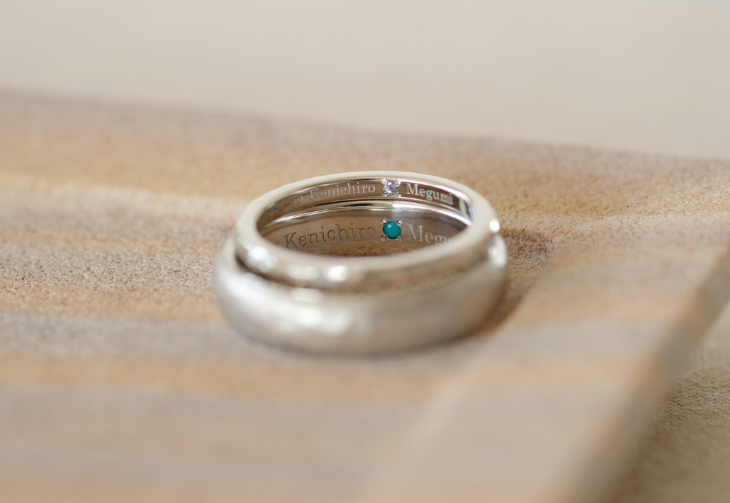 お二人のお仕事にちなんで、内側にはしめ縄を合わせ彫りにて入れさせていただきました。