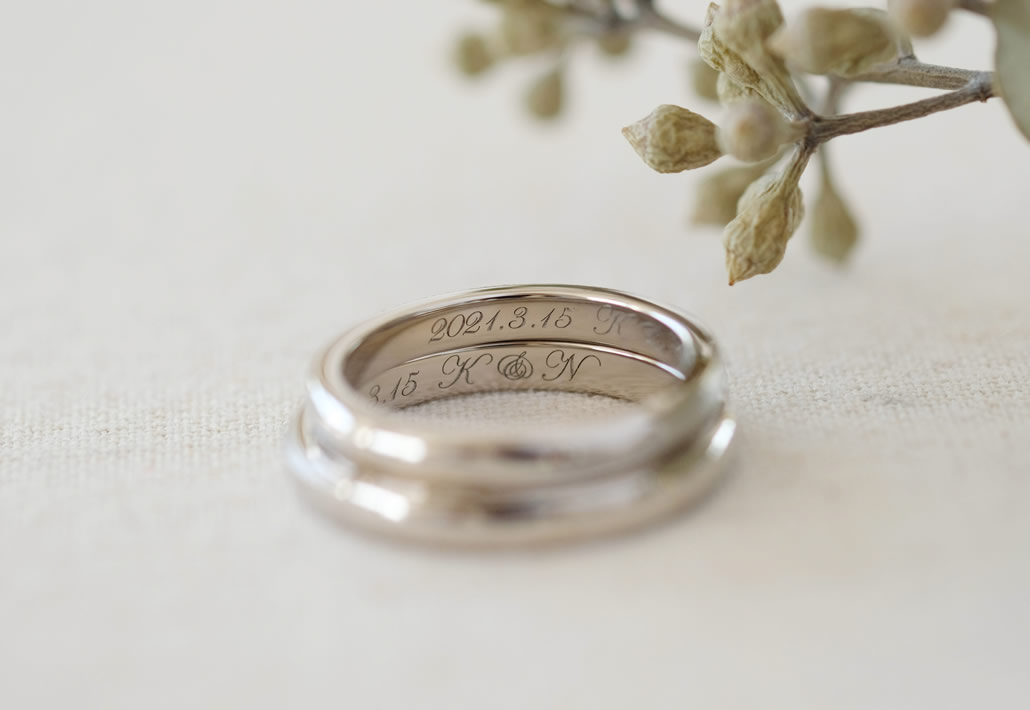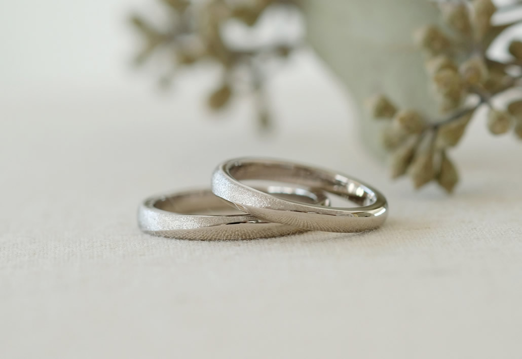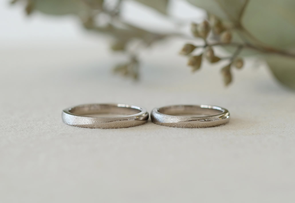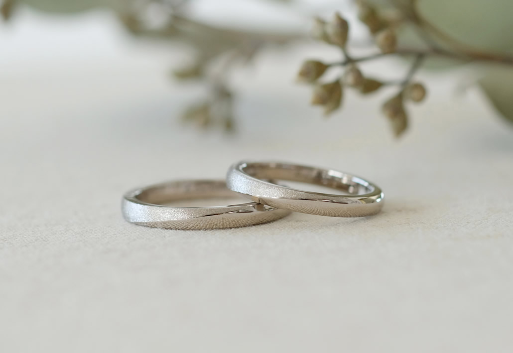 鏡面とマットの切り替えを取り入れることで、見る角度で印象が変わり、ホワイトゴールドの落ち着いた印象を楽しめる結婚指輪となりました。