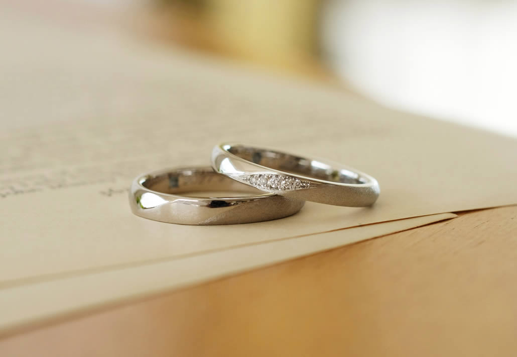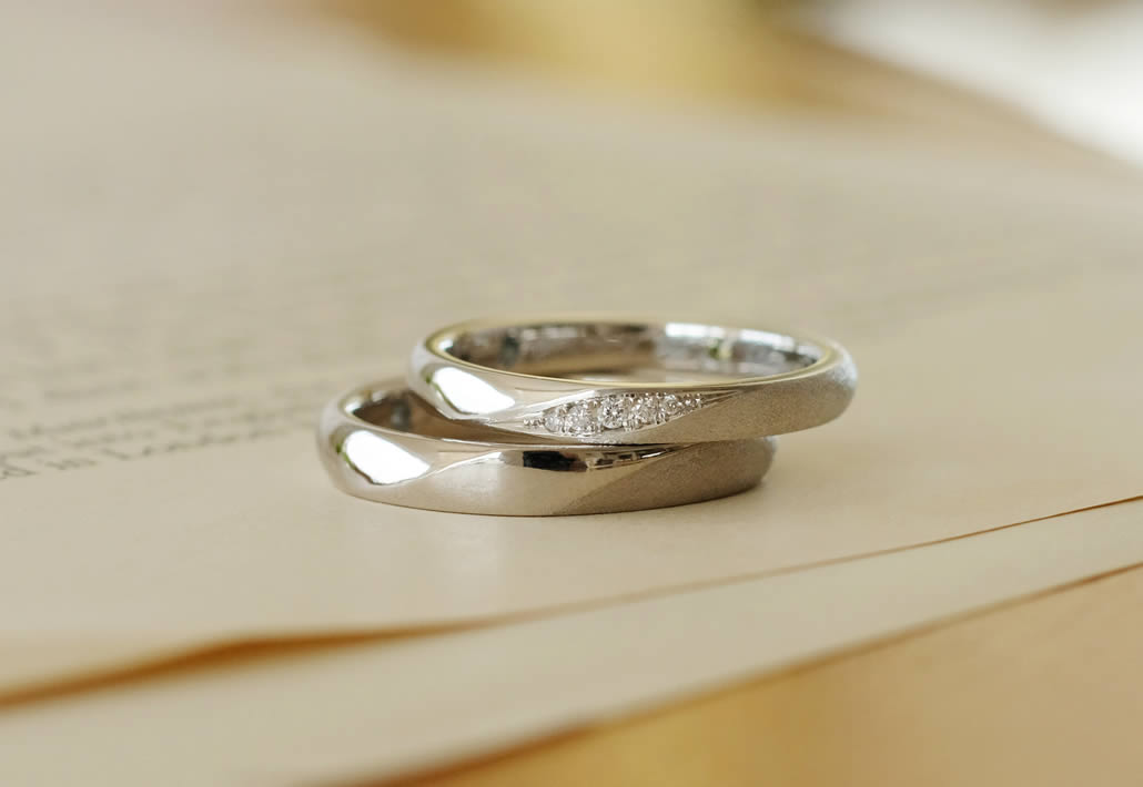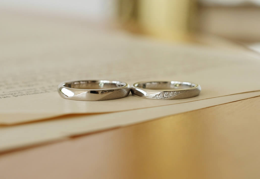 男女共に中心に立体感を出し、鏡面とマットの仕上がりをお揃いにしておりますが、素材はそれぞれ肌に馴染むものを選ばれました。