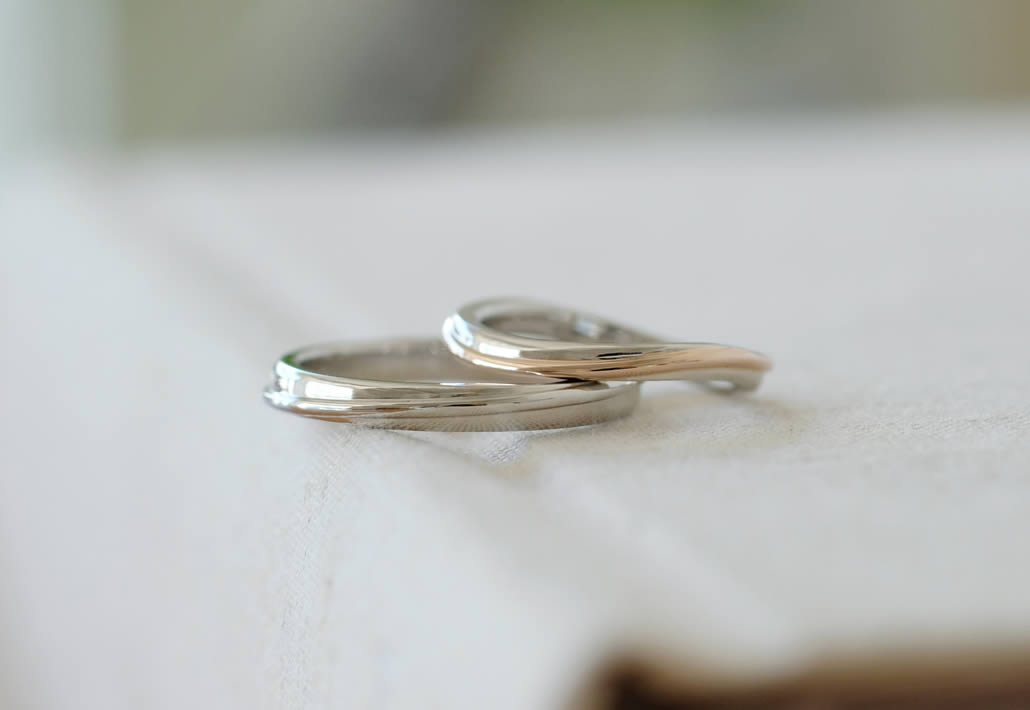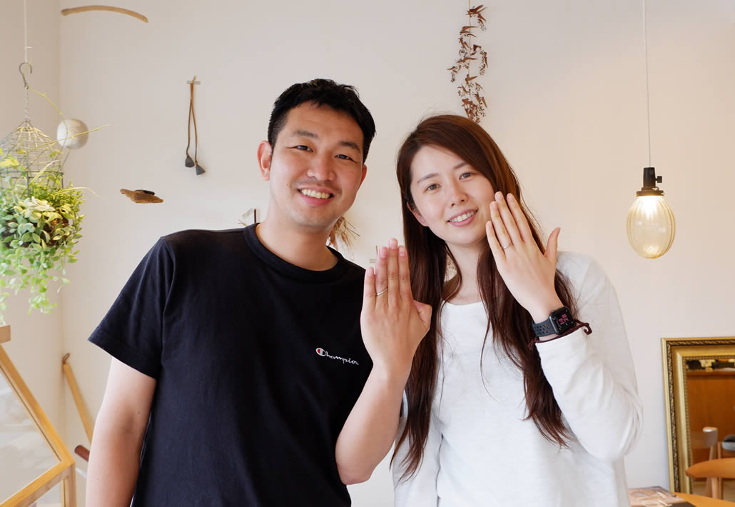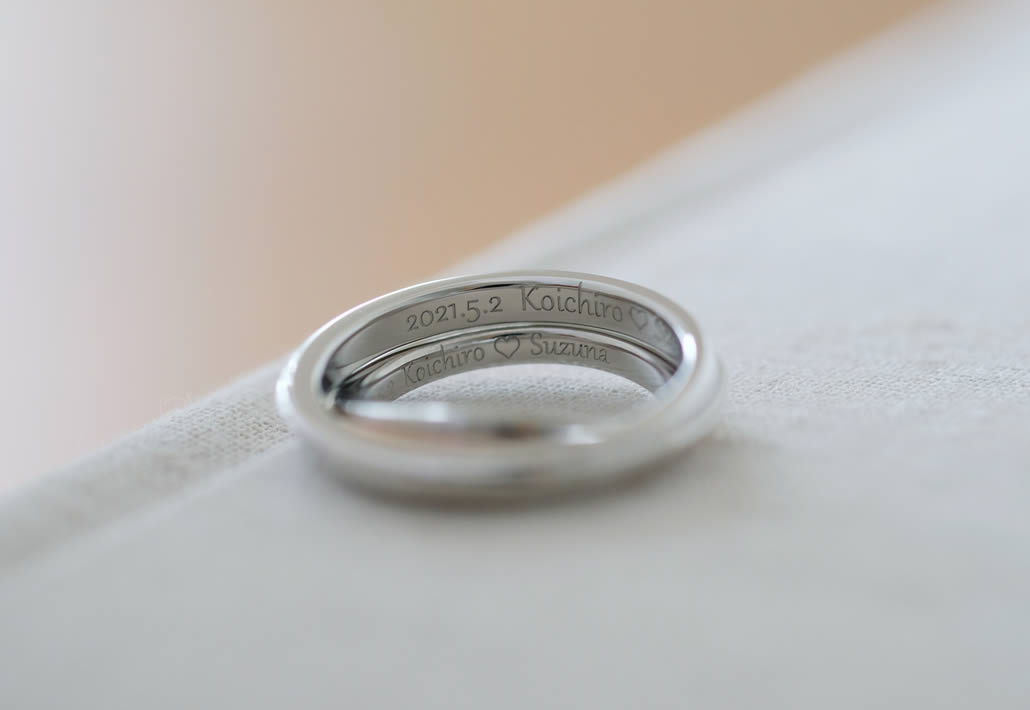 男性用リングは女性のデザインとお揃いの要素を入れつつ、ストレートで着けやすさを大切にし、お互いの希望を叶えたオーダーメイドらしいオリジナリティのある結婚指輪が完成いたしました。