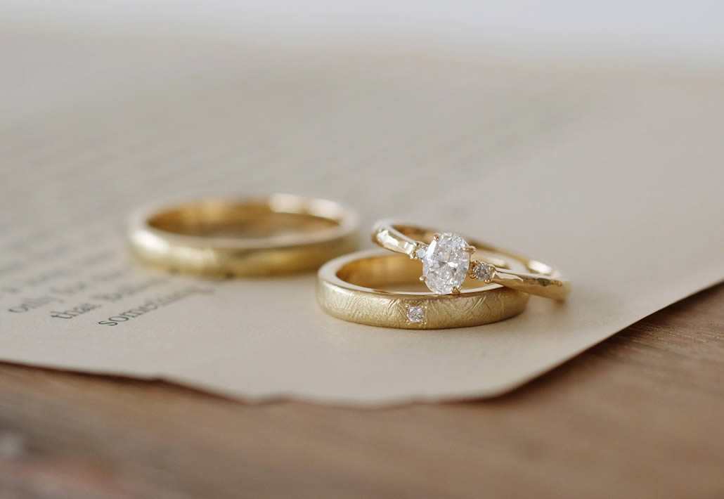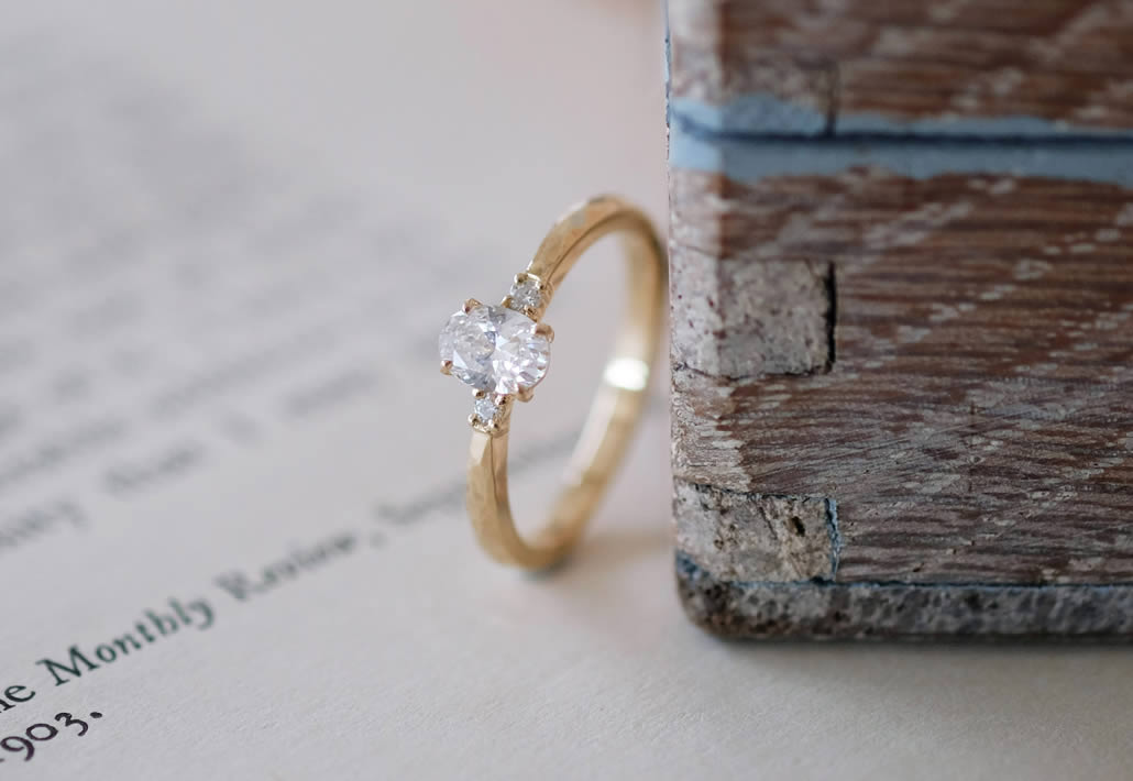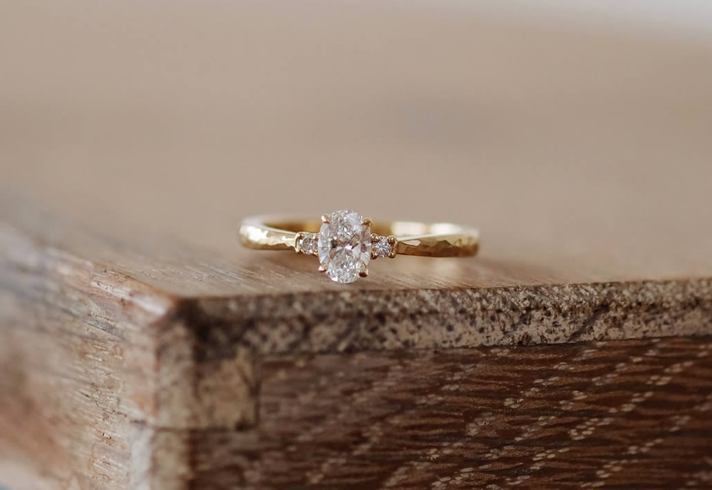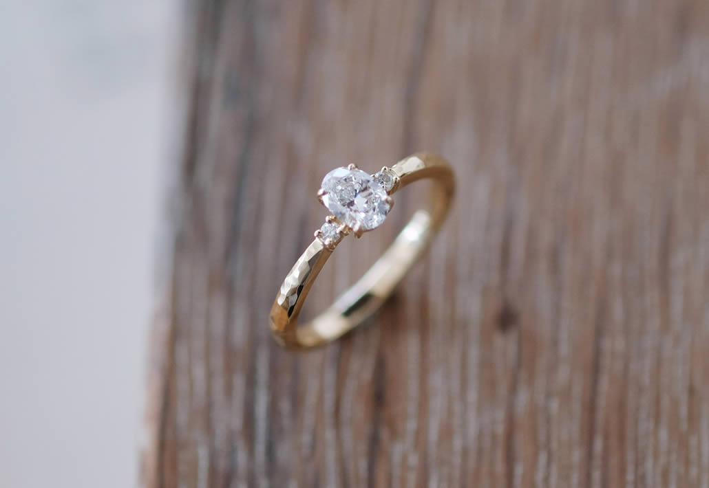 鎚目で仕上げたイエローゴールドの華やかな色合いと、0.3ctの眩しい輝きが存在感を放つエンゲージリングが完成いたしました。