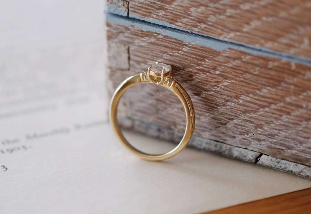 ダイヤのフォルムが映えるようにシンプルなデザインにし、さりげなく小さなメレダイヤを両サイドに添えました。