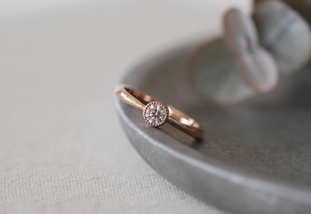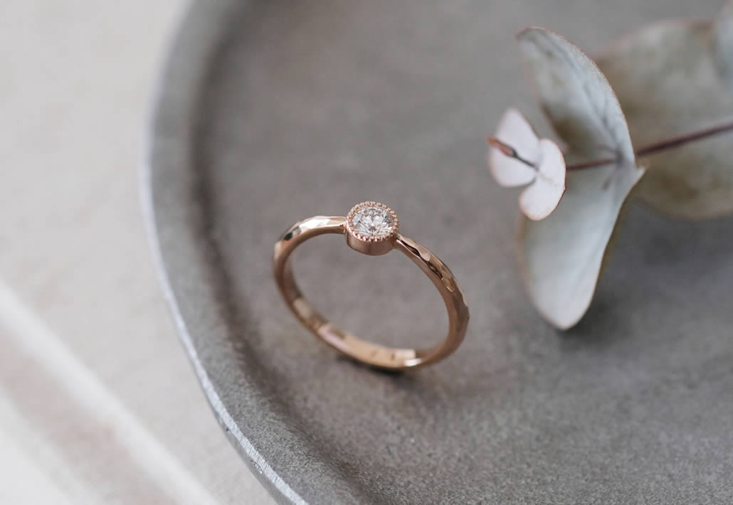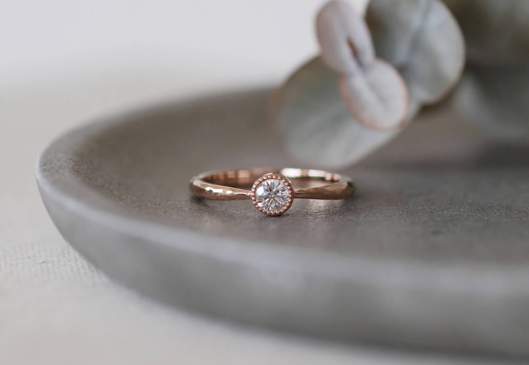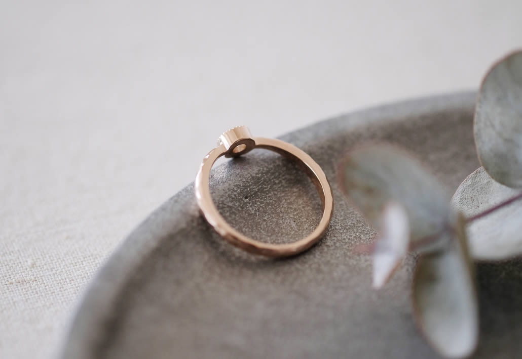 さりげなく入れたリングの鎚目加工は、重ね付けをするご結婚指輪と合わせてセット感を大切にしました。