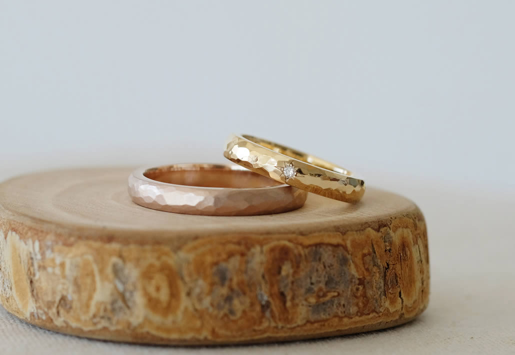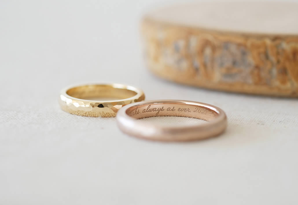 素材と質感を変えることで、お二人の好みを反映し、リング内側にはメッセージを入れることでお互いを思い合った手作り結婚となりました。