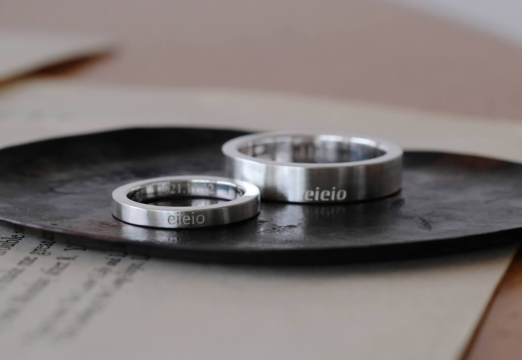 リング正面には「eieio(エイエイオー)」の掛け声を刻印し、遊び心のあるデザインが微笑ましい結婚指輪となりました。