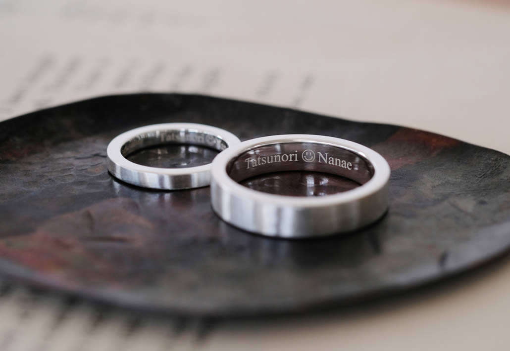 アクセサリーがお好きで、普段からシルバーを良く身に付けておられるお二人らしく結婚指輪もボリュームがあるシルバーを選ばれました。厚みと幅をもたせて地金をたっぷり使用し、かつシルバーらしく経年変化を楽しめます。