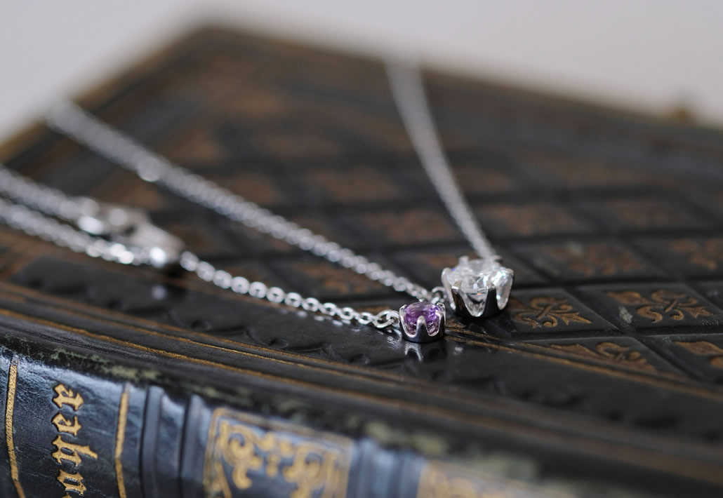 チェーンの長さを調節するアジャスターチャームには、新婦様の誕生石アメジストがさりげなく添えられシンプルさの中にもオーダーらしいオリジナリティを感じられる特別な婚約ペンダントが完成いたしました。