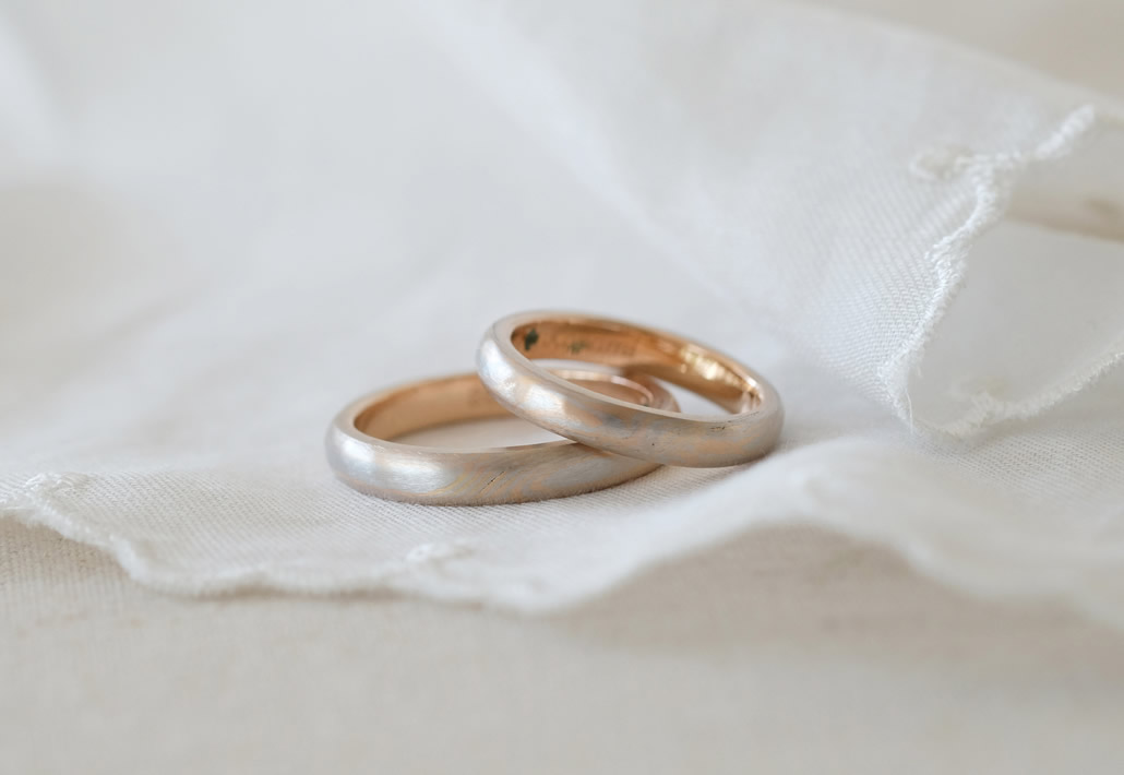 プラチナとピンクゴールドを組み合わせた木目金はその時に偶然に出来る模様が楽しめます。