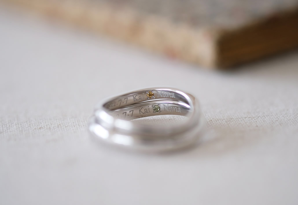 内側にはお二人の誕生石をお名前、記念日を彫刻し、おふたりだけのマリッジリングが完成いたしました。