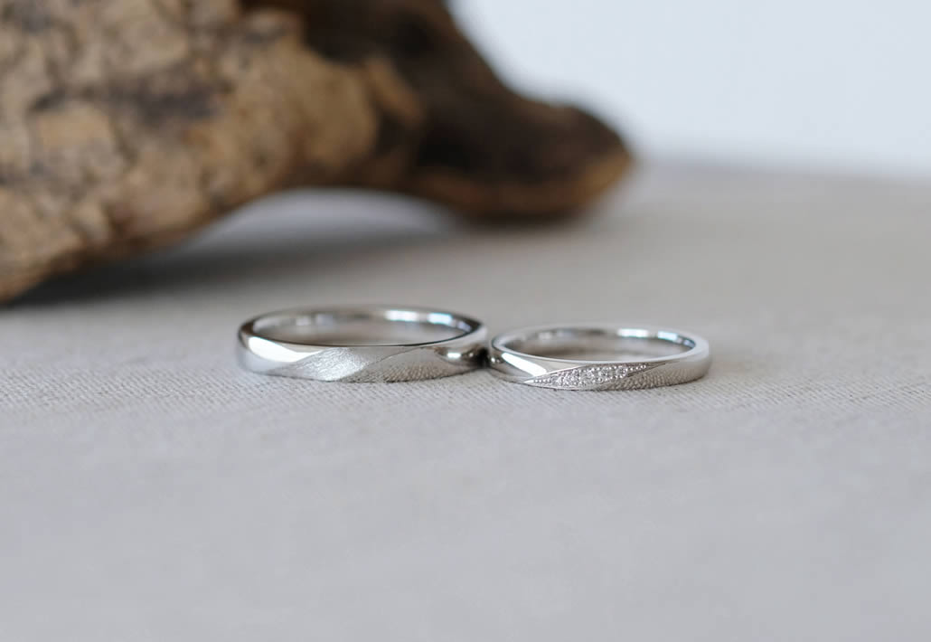 男性はマット部分に凹み加工のアクセントを取り入れ、女性はダイヤモンドを留め