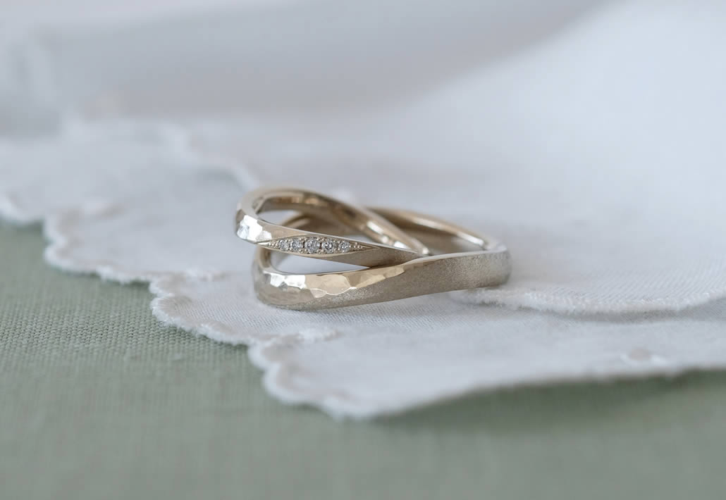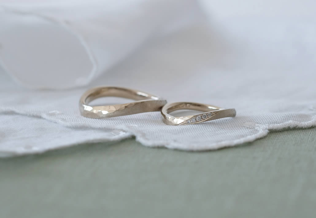 手作り結婚指輪のデザインとしては、作業の工程が多く難易度が高いウェーブ(S字)のフォルム。