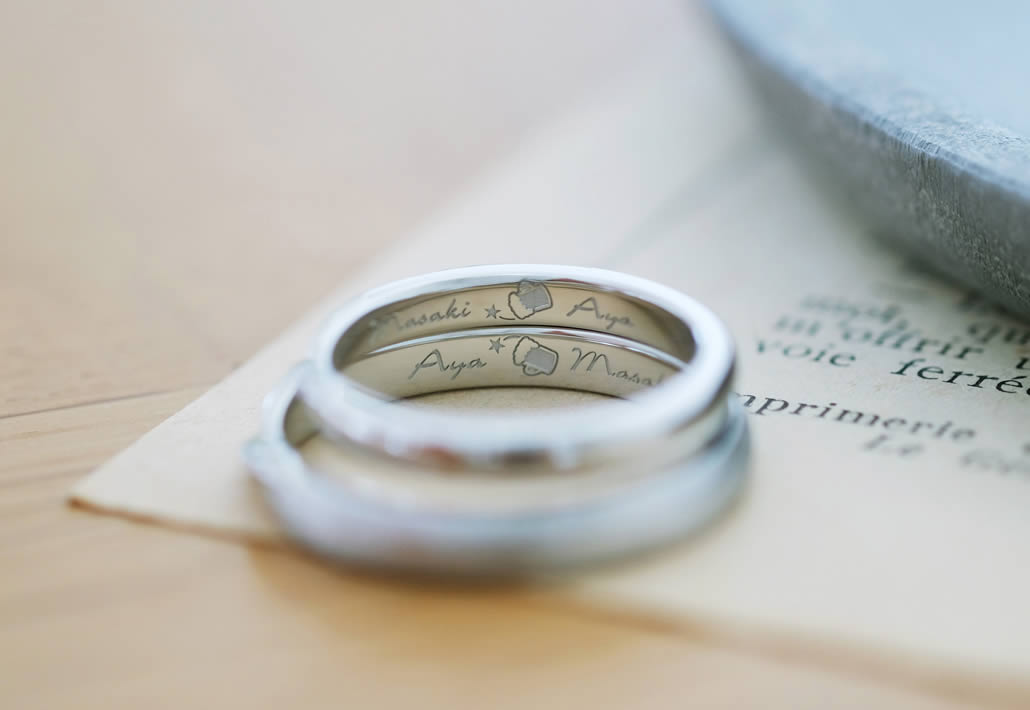 内側にはおふたりのお好きなビールのイラストを彫刻しております。