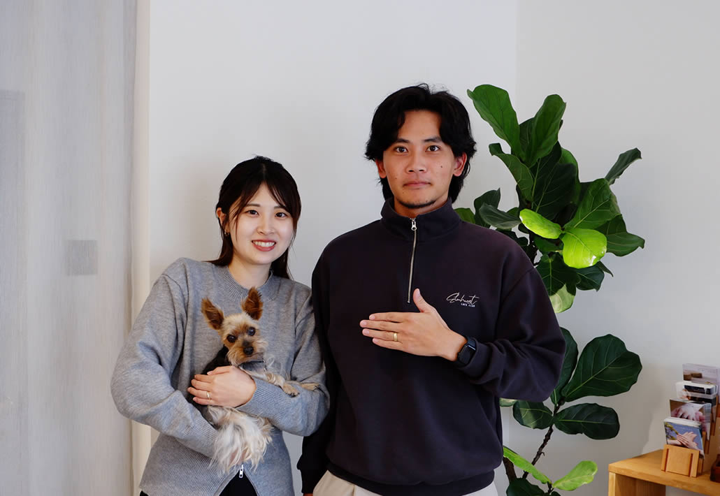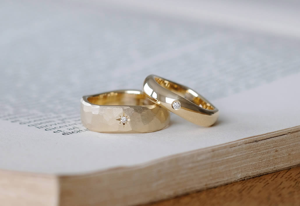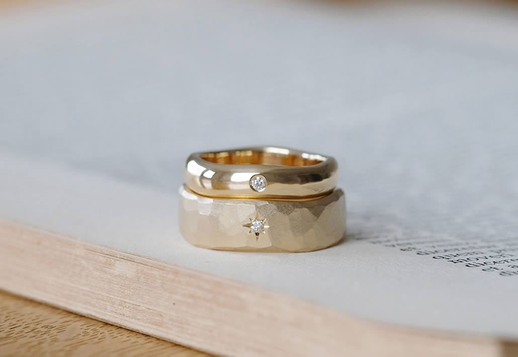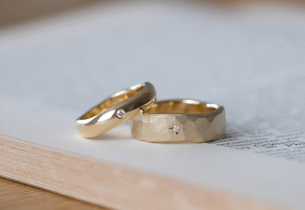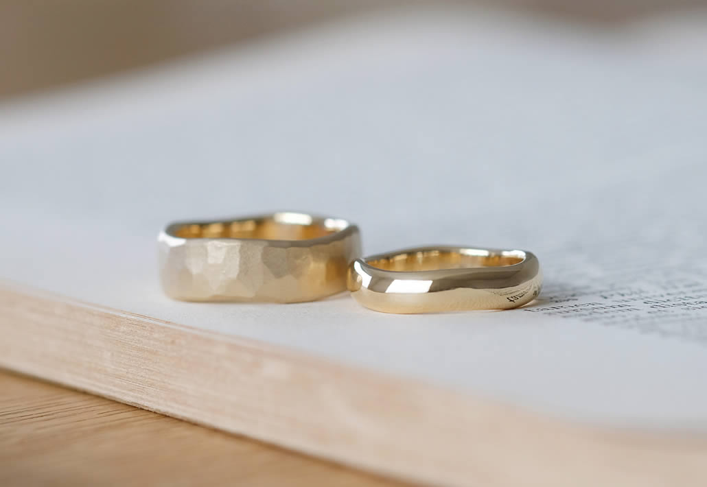 一般的な結婚指輪に良く見られる細身なデザインではなく、おふたりともボリュームのある地金をしっかりと使った幅広のマリッジリングをご希望でした。