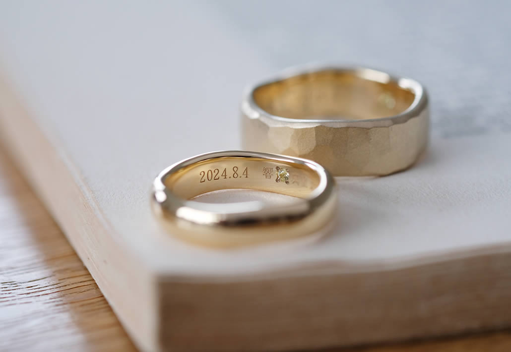 イエローゴールドの質感とフォルムはそれぞれにお好きなデザインにし、緩やかなカーブを揃えて、実は2本が重なるように設計された仕掛けがおふたりらしい表現です。一見して全く違うデザインでありながら、繋がりを持たせることができるのはオーダーメイドならではです。