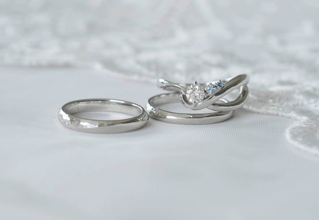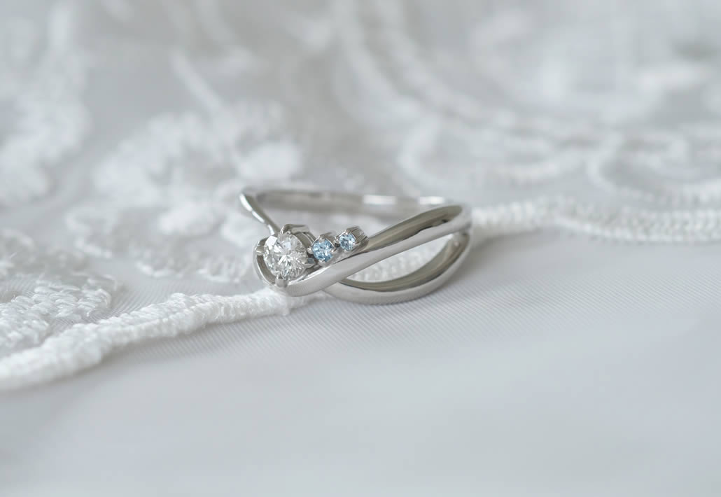 ダイヤモンド選びから、ご自身の誕生石に変更したりとアレンジを加えていきながら、オーダーメイドならではのオリジナリティを形にしていきました。セットでご依頼いただいたご結婚指輪も同時にお打ち合わせさせていただき、全体的なまとまりも大切にデザインいたしました。