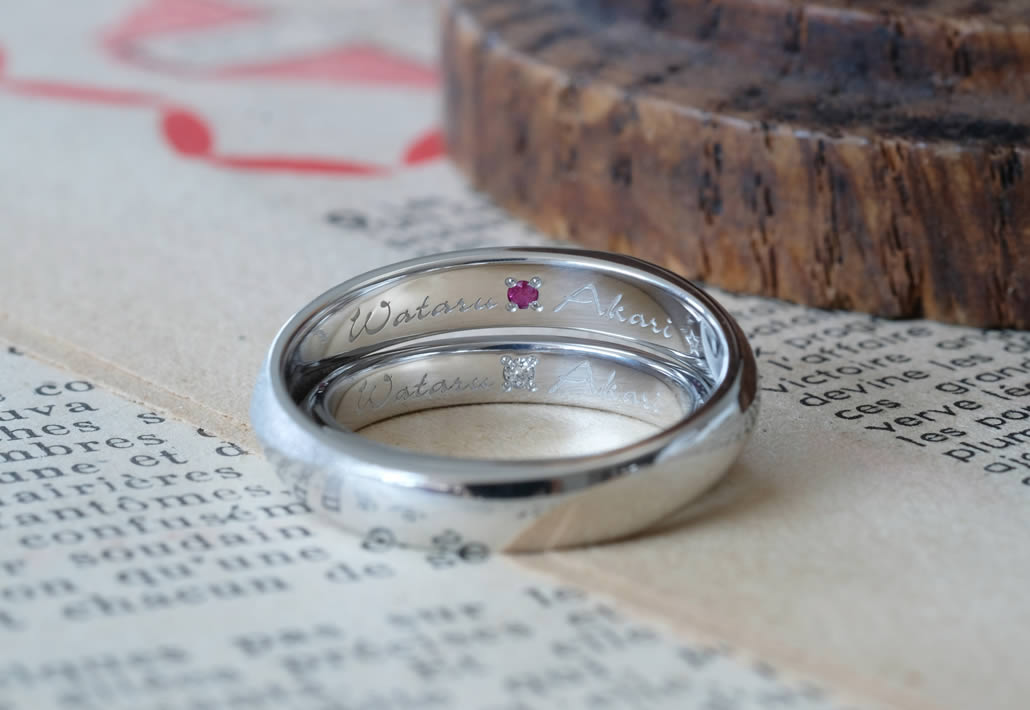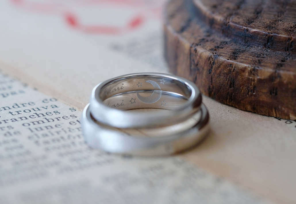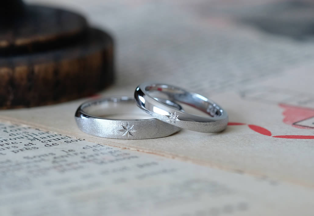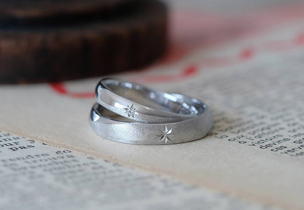 ななめのラインを境に仕上げが切り替わるデザインですが、星型のダイヤの石留・星型の彫りをいれてアクセントにいたしました。内側には重ねた時だけにあらわれる三日月のマークが、おふたりだけの絆を感じさせます。